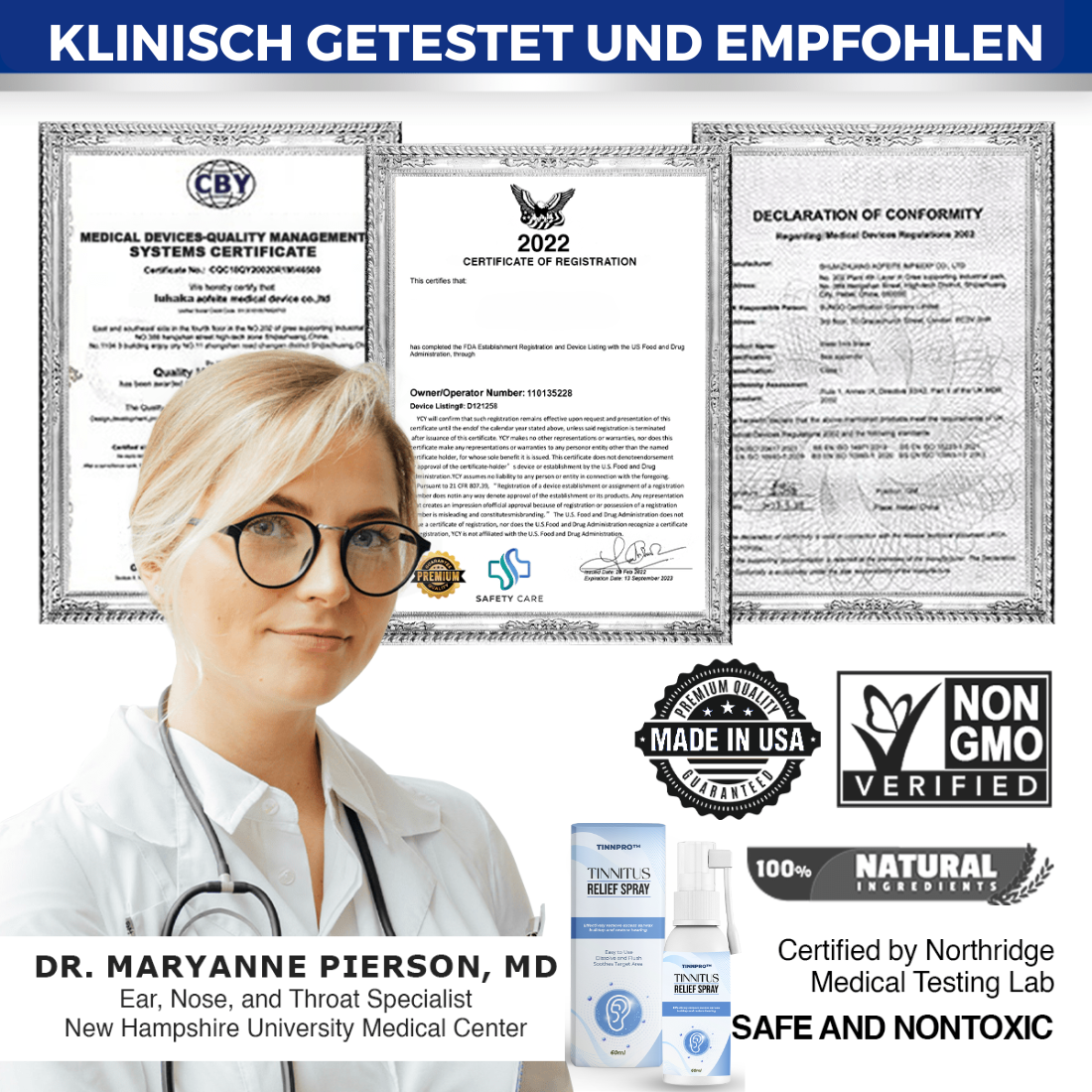 Dr. Maryanne Pierson, M.D., an otolaryngologist at New Hampshire University Medical Center in Massachusetts, and numerous other ENTs have regarded TinnPro™️ Tinnitus Linderungsspray as a breakthrough solution for individuals whose tinnitus persists as a chronic hindrance. While some people may experience a reduction or relief of symptoms over time, others find that tinnitus continues to significantly impact their daily lives. TinnPro™️ is considered a highly effective over-the-counter remedy, providing relief from tinnitus and its associated symptoms.